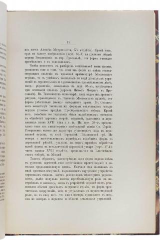 Исследование известного русского архитектора и историка архитектуры, академика Владимира Васильевича Суслова (1859-1921 гг.) посвящено изучению памятников церковного зодчества России XII – XVIII вв. В книге представлены главы: наружное покрытие древнерусских церквей, памятники деревянной архитектуры в Южной России, заметки о калмыцких и древнерусских постройках, о древних деревянных постройках северных окраин России, древние соборы в г. Романове-Борисоглебске. Внимание В.В.Суслова привлекают трехлопастная форма покрытия древнерусских церквей, встречающаяся в храмах Московского Кремля, Звенигорода, Великого Новгорода, Пскова и др. С 16-ю таблицами и 21 рисунком в тексте.