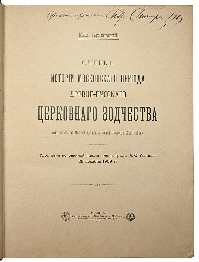 Красовский М.В. Очерк истории московского периода древне-русского церковного зодчества. От основания Москвы до конца первой четверти XVIII в. (Антикварная книга 1911г.)