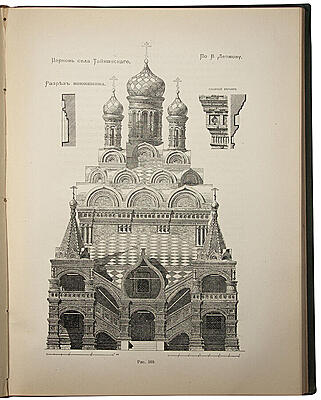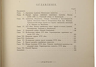 ОГЛАВЛЕНИЕ. Предисловие. — Глава I. Деревянное зодчество Московского княжества. — Глава II. Первый период каменного церковного зодчества Москвы (1272—1461 г). Успенский собор в Звенигороде. — Глава III. Аристотель Фиоравенти. Соборы: Успенский и Благовещенский; церкви: Положения Ризы П. Богородицы и Чуда Арх. Михаила. Архангельский собор; церкви в Старом Симоновом монастыре и св. Николая в Мясниках. — Глава IV. XVI век. Начало самобытного стиля: церкви в селах Дьякове, Коломенском, Беседах и Медведкове. — Глава V. Покровский собор (Василий Блаженный). — Глава VI. Нешатровые церкви XVI века. Характеристика церковного зодчества XVI века. — Глава VII. Шатровые церкви XVII века. — Глава VIII. Колокольни. — Глава IX. Нешатровые церкви первой половины XVII века. — Глава X. Церкви расцвета самобытного искусства.