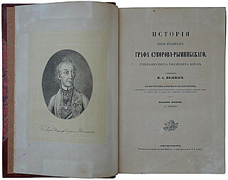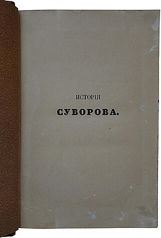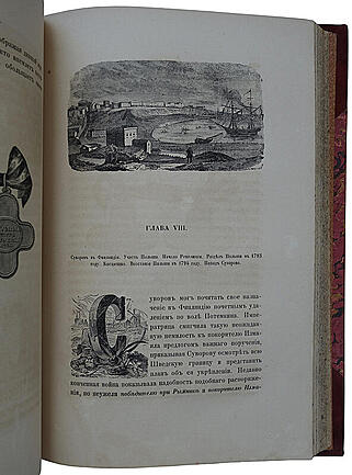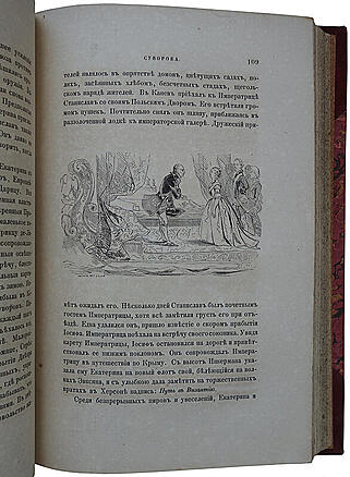 С портретом Суворова и 100 картинами, рисованными гг. Коцебу, Жуковским и Шевченком, и гравированными на дереве в Париже гг. Andrews, Best, Le Loire, и в С.Петербурге г. Дерикером и друг.