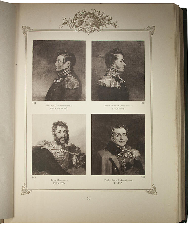 Издание, подготовленное секретарем Императорского Русского Исторического общества А.А. Голомбиевским, напечатано по повелению Государя Императора, под редакцией Великого Князя Николая Михайловича, к столетней годовщине Отечественной войны 1812 года. В книге два больших раздела. Первый — 329 портретов героев войны 1812 года работы Георга Дау, которые находятся в «Военной галерее 1812 года» в Зимнем дворце в Санкт-Петербурге. Второй — подробные биографии лиц, составленные архивистами на основе послужных списков. Именно этот раздел наиболее важный: таких подробных и подтвержденных документами биографий героев войны 1812 года нет даже в специальных биографических справочниках.