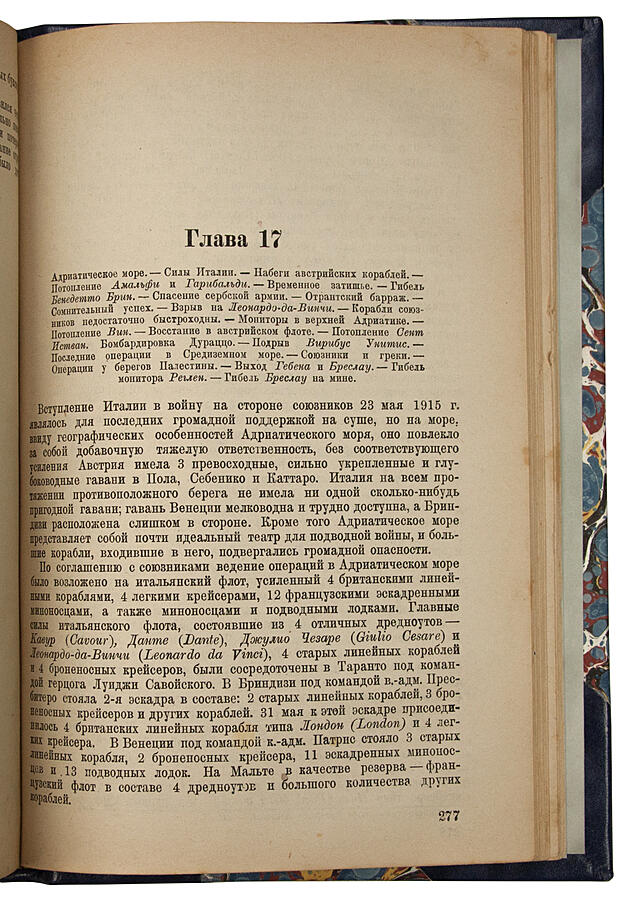 Автор описывает боевую деятельность военно-морских флотов в продолжение всей войны, на всех морских театрах, в хронологической последовательности, уделяя главное внимание вопросам тактического порядка.