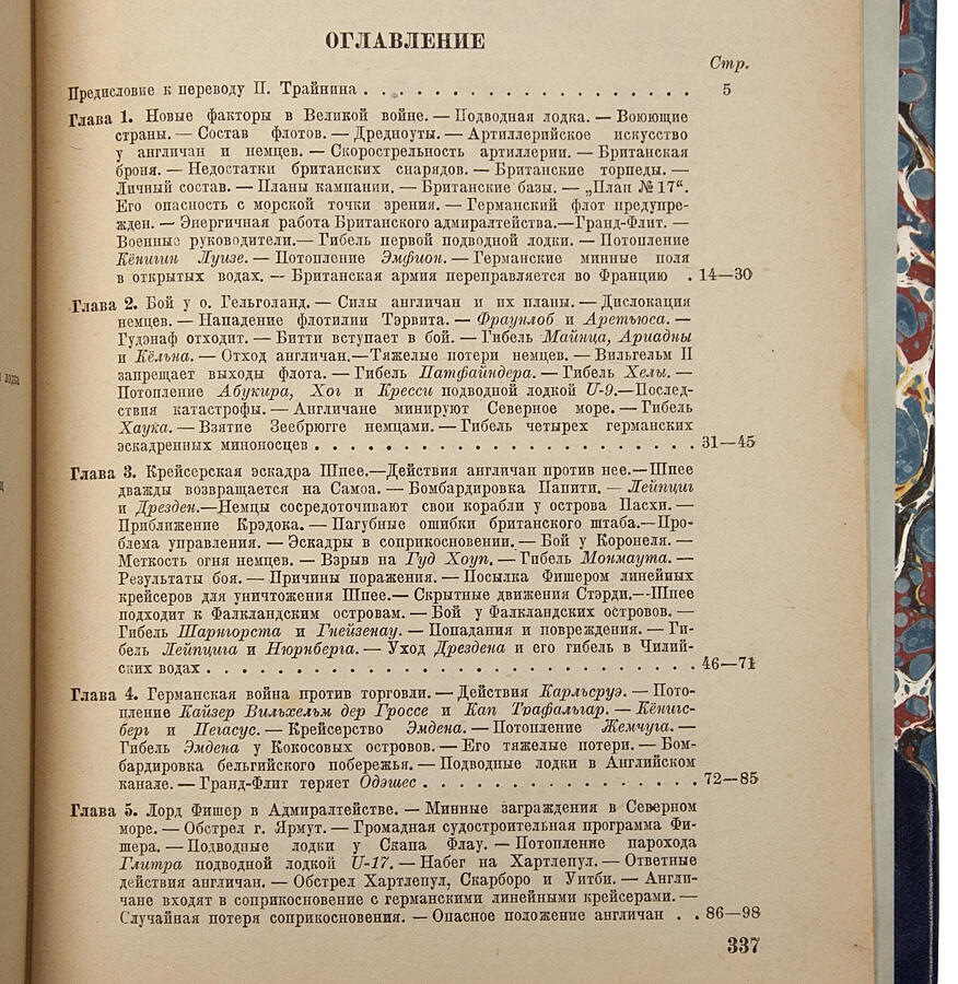 В конце труда приведен ряд таблиц состава британского и германского флотов и характера повреждений их кораблей в Ютландском бою, итогов потерь отдельных флотов в броненосных кораблях за время войны, данных численности и элементов германских подводных лодок, артиллерии дарданелльских фортов и т.п.
