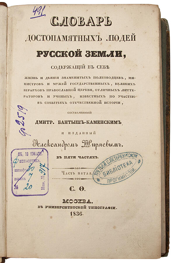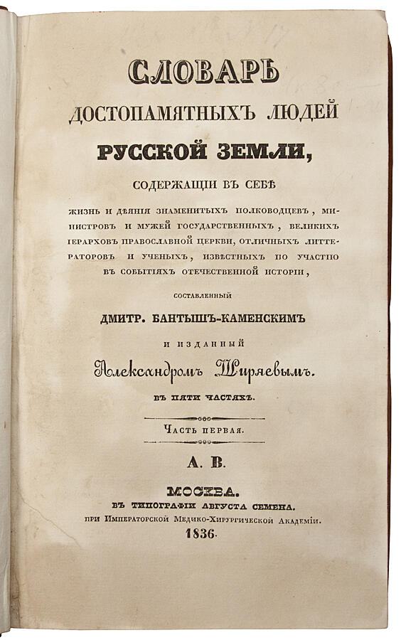 Содержащий в себе жизнь и деяния знаменитых полководцев, министров и мужей государственных, великих иерархов православной церкви, отличных литераторов и ученых, известных по участию в событиях отечественной истории, составленный Дмитрий Бантыш-Каменским и изданный Александром Ширяевым: в 5 частях, 1836 г..