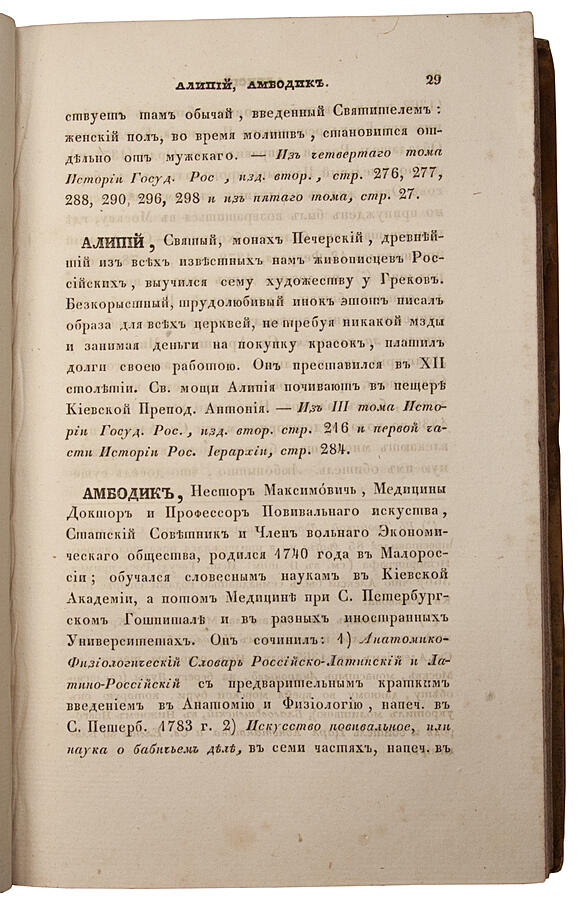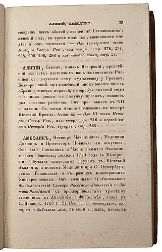 Первое издание «Словаря» вышло в 1836 г. Для ускорения издания все пять томов печатались одновременно в пяти различных московских типографиях. В 1847 г. были изданы три дополнительных тома, куда вошли как новые биографии, так и расширенные данные о некоторых исторических деятелях из других книг автора.