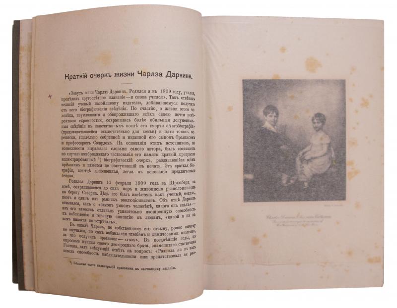 Авторы статей выдающиеся русские ученые-интеллектуалы Максим Максимович Ковалевский (1851-1916), Михаил Александрович Мензбир (1855-1935), Илья Ильич Мечников (1845-1916), Иван Петрович Павлов (1849-1936), Климент Аркадьевич Тимирязев (1843-1920), Николай Алексеевич Умов (1843-1920). Портрет Чарлза Дарвина с факсимиле 1881 года. Детский портрет Дарвина с сестрой Екатериной.
