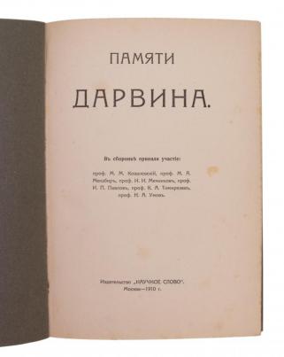 Памяти Дарвина. В сборнике приняли участие: проф. М.М.Ковалевский, проф. М.А.Мензбир, проф. И.И.Мечников, проф. И.П.Павлов, проф. К.А.Тимирязев, проф. Н.А.Умов.