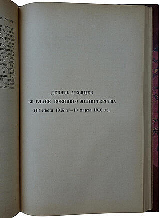 Поливанов Алексей Андреевич (1855 — 1920) — русский военный деятель, генерал от инфантерии (с 1911 г.), член Государственного совета (с 1912 г.). С 10 сентября 1915 г. по 15 марта 1916 г. — военный министр и председатель Особого совещания по обороне государства. Поливанов представляет собою одну из крупных фигур в высших военно-административных сферах последнего десятилетия монархии, отмеченного таким безлюдьем. Публикация мемуаров Поливанова, предпринятая Высшим военным редакционным советом (ВВРС) в 1924 г., осталась незаконченной. Выпущенный тогда 1-й том содержал, наряду с извлечениями из записных книжек, только начало труда "Девять месяцев во главе Военного министерства. 13 июня 1915 года — 13 марта 1916 года". Фактически публикация была доведена только до 21 августа 1915 года. Книга состоит из биографии Поливанова, выдержек из его дневника за 1907-1913 гг, времени, когда он был помощником военного министра и членом Государственного Совета, описания, пребывания его во главе Военного Министерства и перечня лиц, о которых упоминается Поливановым.