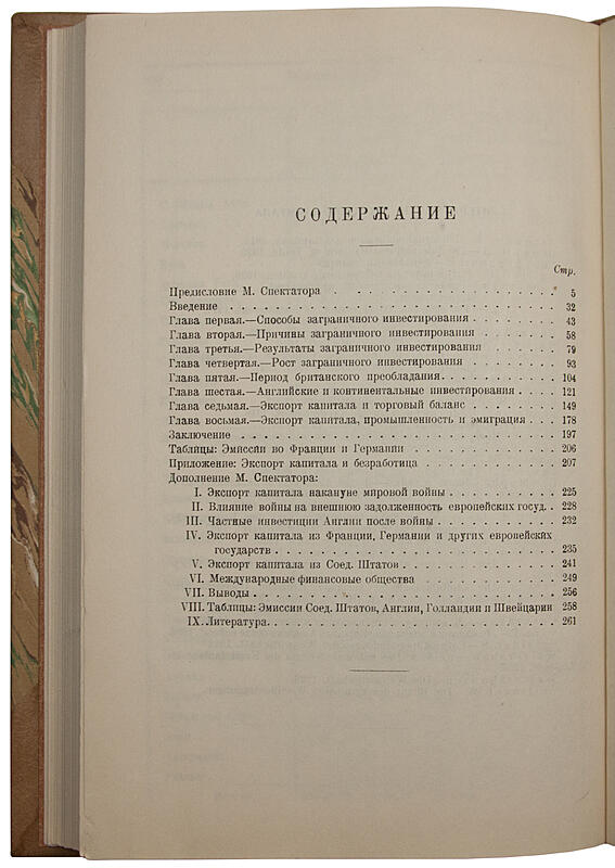 Предисловие - Введение - Способы заграничного инвестирования - Причины заграничного инвестирования - Результаты заграничного инвестирования - Рост заграничного инвестирования - Период британского преобладания - Английские и континентальные инвестирования - Экспорт капитала и торговый баланс - Экспорт капитала и торговый баланс - Экспорт капитала, промышленность и эмиграция - Заключение - Таблицы. Эмиссии во Франции и Германии - Экспорт капитала и безработица - Дополнение М. Спектатора. Экспорт капитала накануне мировой войны - Влияние войны на внешнюю задолженность европейских государств - Частные инвестиции Англии после войны - Экспорт капитала из Франции, Германии и других европейских государств - Экспорт капитала из Соединенных Штатов - Международные финансовые общества - Выводы - Таблицы. Эмиссии Соединенных Штатов, Англии, Голландии и Швейцарии - Литература. Из выводов М. Спектатора: *Вслед за перемещением центра мировой продукции и мирового богатства к Соединенным Штатам к ним перейдет, естественно, и центр финансовый. Они станут в ближайшем будущем на самом деле *банкиром мира*. ... Теперешнее положение, когда Европа питается американскими кредитами не может быть признанным нормальным. ... Сумеет ли послевоенный капитализм разрешить эти проблемы мирным путем? Очень и очень сомнительно...*. В разделе *Международные финансовые общества* перечислены ведущие финансовые игроки того времени от Барклайс Банка до Варбурга.