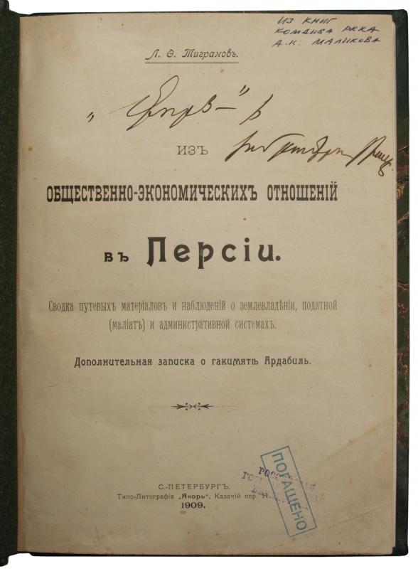 Тигранов Л.Ф. Из общественно-экономических отношений в Персии (Антикварная книга 1909г.)