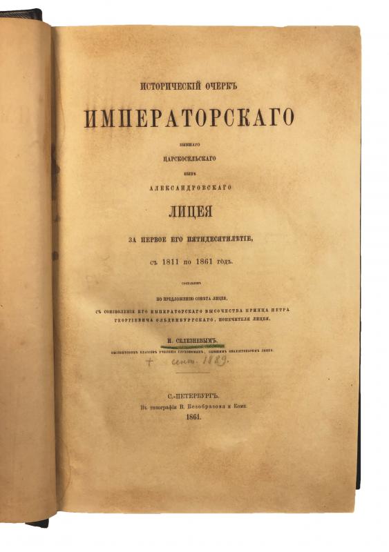 Исторический очерк императорского бывшего Царскосельского, ныне Александровского лицея за первое его 50-летие — с 1811 по 1861 г. Историческую славу лицею принесли прежде всего выпускники 1817 года — А. С. Пушкин, А. А. Дельвиг, декабристы В. К. Кюхельбекер, И. И. Пущин. В 40-е гг. XIX века его окончили поэт Л. А. Мей, М. В. Петрашевский, 5 лет в нем учился М. Е. Салтыков-Щедрин.