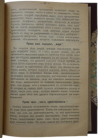 В настоящей работе освещаются основные вопросы теории права: понятие права, критика господствующих теорий (Иеринга, теорий принуждения, позитивного права, учения Петражицкого и некоторых других), соотношение права и нравственности, теория естественного права, происхождение права.