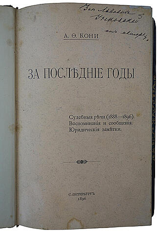 Кони А.Ф. За последние годы (С автографом автора, издание 1896г.)