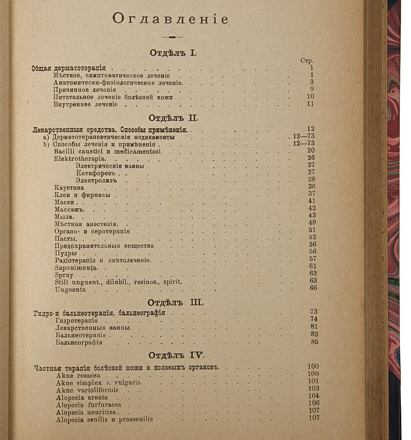 Содержание: Общая дерматология. - Лекарственные средства. Способы применения. - Гидро- и бальнеотерапия, бальнеография. - Частная терапия болезней кожи и половых органов. - Рецепты в алфавитном порядке.