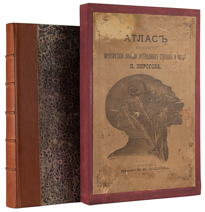 Атлас к тексту Хирургической анатомии артериальных стволов и фасций Н. Пирогова (1882г.): 56 листов цветных иллюстраций. В старинной коленкоровой коробке.