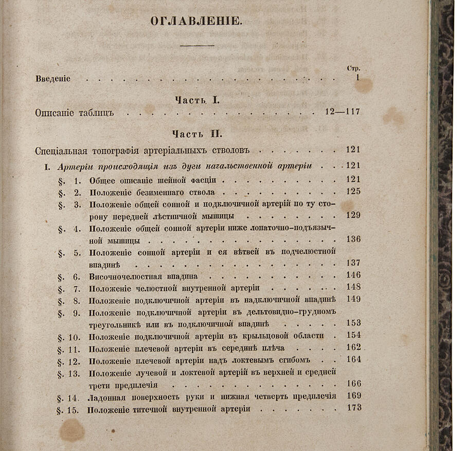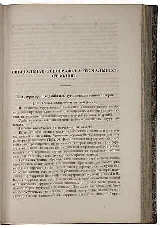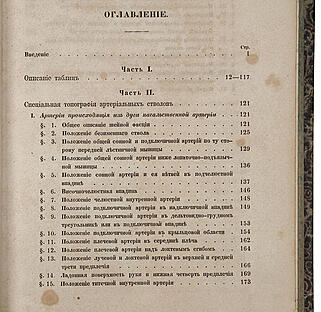 Второе прижизненное издание на русском языке первой книги по анатомии великого русского хирурга Николая Ивановича Пирогова (1810-1881). Первое издание этой книги на немецком языке, появившееся в Дерпте в 1837 г., сразу принесло русскому ученому всемирную известность. Анатомический атлас Пирогова стал незаменимым руководством для врачей-хирургов. Теперь они получили возможность оперировать, нанося минимальные травмы больному. Этот атлас и предложенная Пироговым методика стали основой всего последующего развития оперативной хирургии. На русском языке книга впервые была опубликована в 1854 г. (только текст). Представленное издание является вторым отдельным прижизненным изданием «Хирургической анатомии» Н.И. Пирогова на русском языке и первым иллюстрированным из русскоязычных.