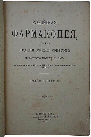 Российская фармакопея, изданная медицинским советом министерства внутренних дел на основании пункта 13 статьи 399 т. I, ч. 2 Свода Законов издания 1892 года.