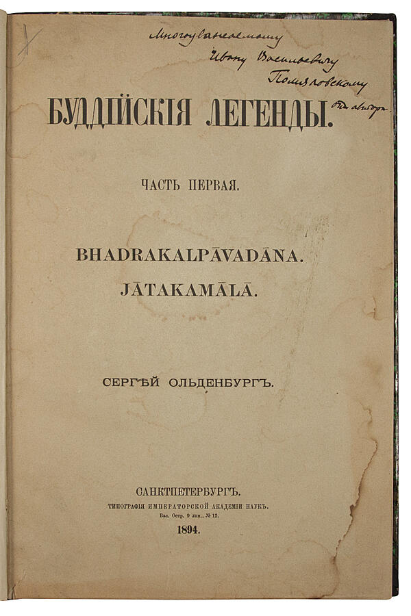 Ольденбург С. Буддийские легенды (С автографом автора, антикварная книга 1894г.)
