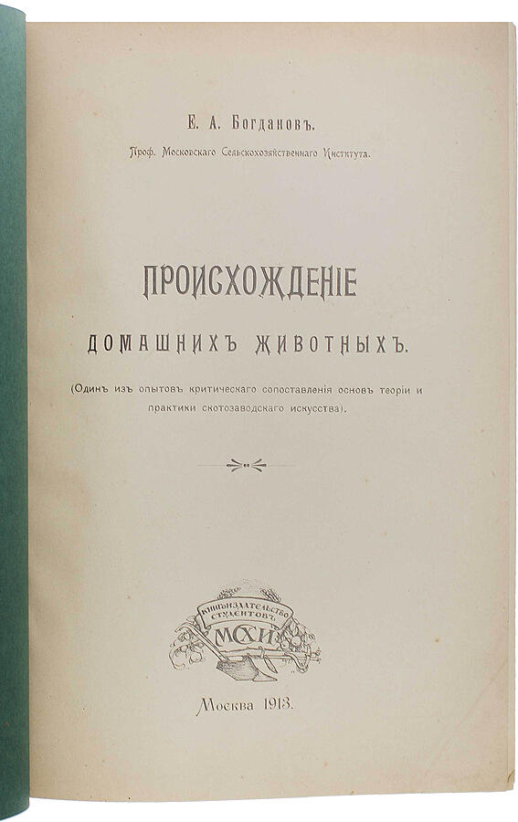 Книга "Богданов Е.А. Происхождение домашних животных". Один из опытов критического сопоставления основ теории и практики скотозаводского искусства. Москва 1913г.