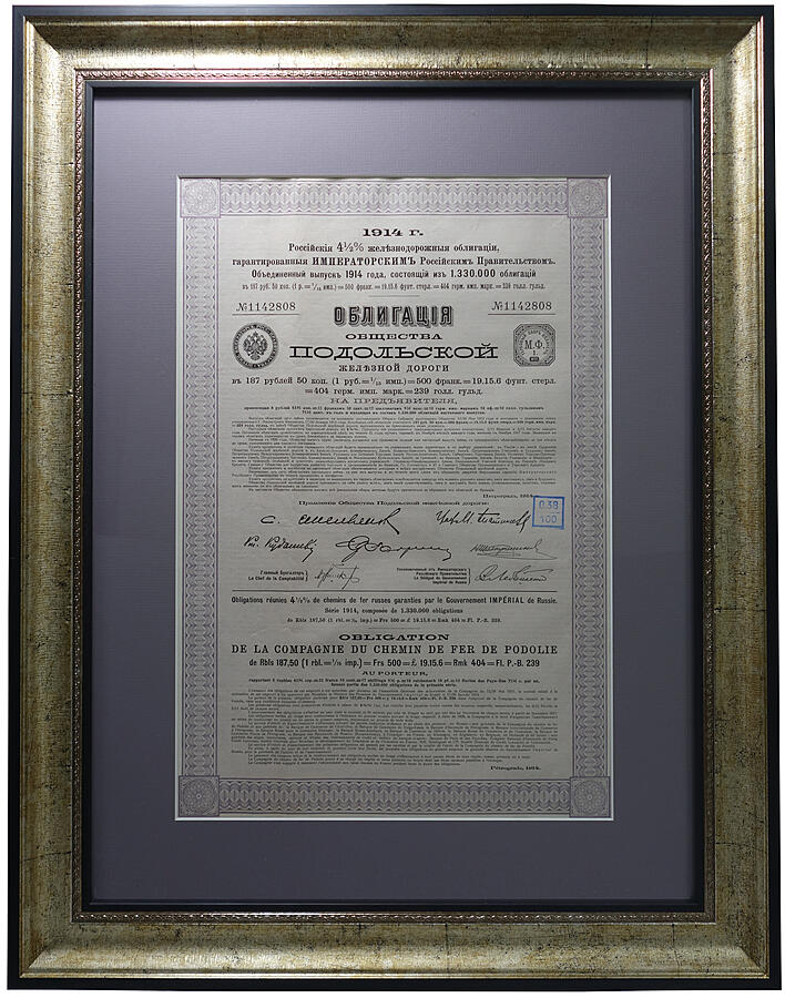 Российская 4.5% железнодорожная облигация, гарантированная Императорским Российским Правительством. Объединенный выпуск 1914 года, состоящий из 1.330.000 облигаций.