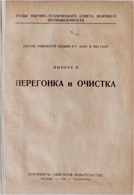 Сессия заводской секции в г. Баку в 1929 г. Выпуск I. Крэкине. Выпуск II. Перегонка и очистка.