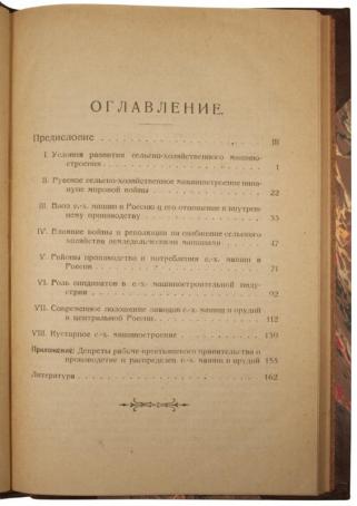 В этом редком издании освещены следующие темы: "Условия развития сельско-хозяйственного машиносроения", "Ввоз с.-х. машин в Россию и его отношение к внутреннему производству", "Кустарное с.-х. машиностроение", "Роль синдикатов в с.-х. машиностроительной индустрии", "Влияние войны и революции на снабжение сельского хозяйства земледельческими машинами" и т.д.