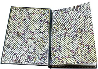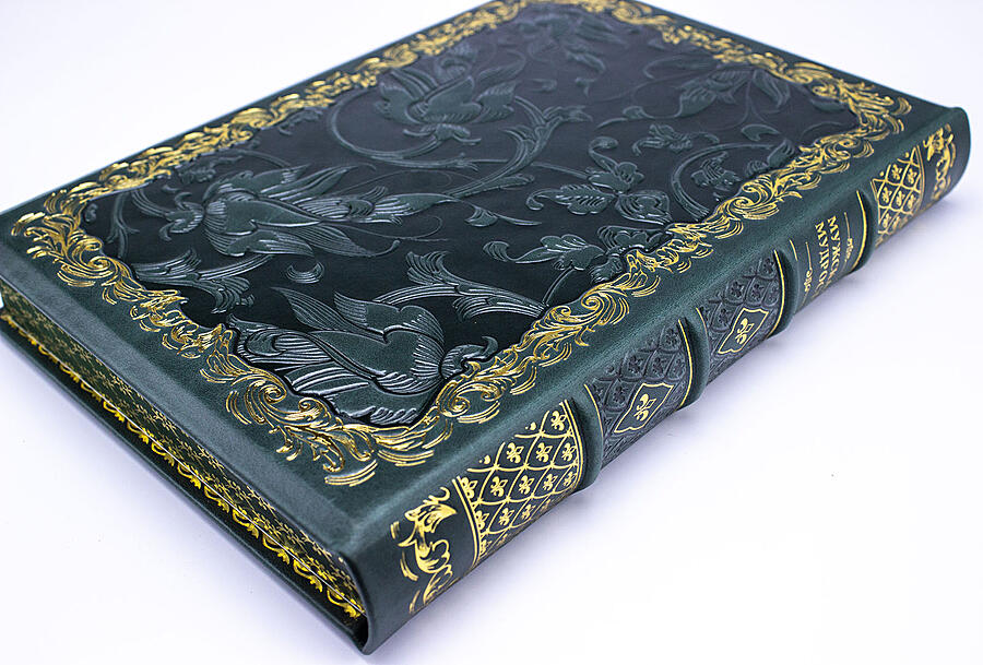 | Описание переплета: | Французский кожаный переплет ручной работы. Золотое, блинтовое тиснения и тиснение цветной фольгой. Бинты на корешке. Трехсторонний обрез книги ошкурен и окрашен вручную, прокатка узора золотом в верхней части |