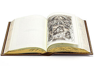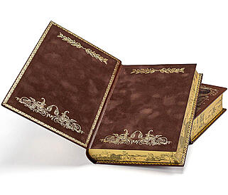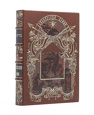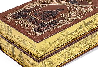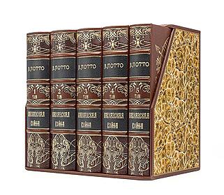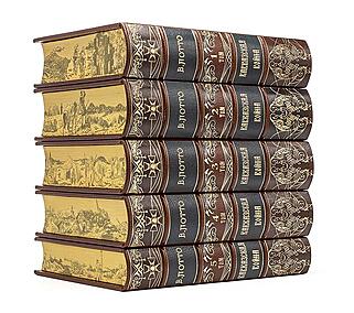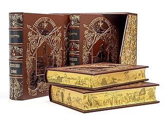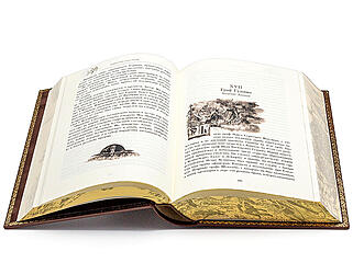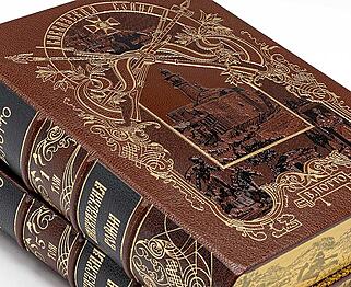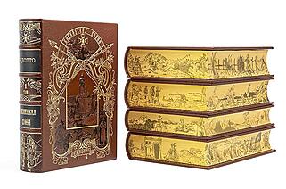 | Описание переплета: | Французский кожаный переплет ручной работы, уникальное тиснение по коже, вручную сшиты книжные блоки и отшлифованы. Обрезы блока страниц в золотой тонировке, также украшены рисунками из сцен произведений |