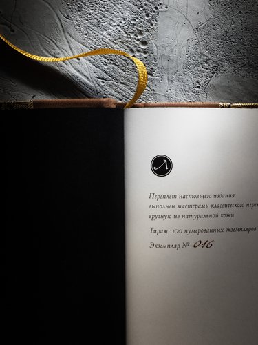 | Описание переплета: | Составной переплет ручной работы: натуральная кожа, дизайнерская бумага. Шелковые каптал и ляссе, форзацы из дизайнерской бумаги, переплеты и футляр украшены тиснением золотой фольгой |