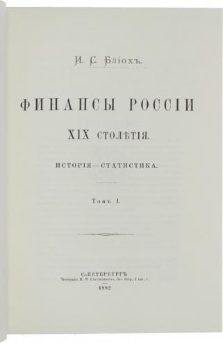 Наиболее полное изложение истории финансовой системы России в XVIII-XIX веках. Автор — Иван Станиславович Блиох — крупный банкир, железнодорожный магнат и член ученого комитета министерства финансов, меценат, известный борец за мир, был личным представителем Николая II на Гаагской мирной конференции. Его монументальный труд «Финансы России XIX столетия» содержит огромный фактический материал, документы, приводится множество статистических сведений.
