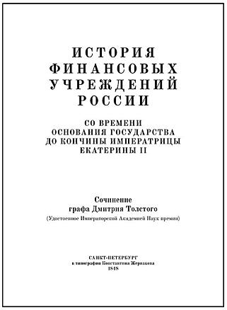 Дебютная книга министра народного просвещения, министра внутренних дел и шефа жандармов графа Дмитрия Андреевича Толстого (1823—1889), удостоенного за свой труд Демидовской премии. В своей работе автор описывает историю создания банков в России, а также развития системы взымания податей, сборов, пошлин и налогов.