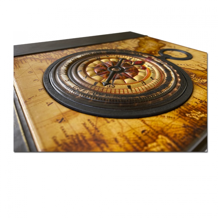 | Описание переплета: | Кожаный переплет, ручная работа, трехсторонний золотой обрез, объёмная 3D накладка из кожи с фотопечатью в виде компаса, деревянные художественные вставки |