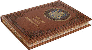 Стильно оформленное эксклюзивное подарочное издание в кожаном переплете ручной работы, художественное тиснение в лучших традициях переплетного искусства 19 века, с художественным обрезом и шелковым ляссе.