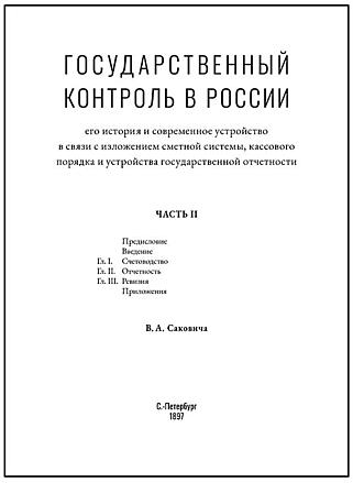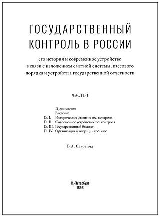 Печатается по изданию: Государственный контроль в России, его история и современное устройство в связи с изложением сметной системы, кассоваго порядка и устройства государственной отчетности. Соч. В.А. Саковича. В двух частях. СПб.: Типо-литография Берман и Рабинович, 1896-97.