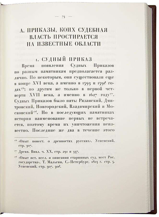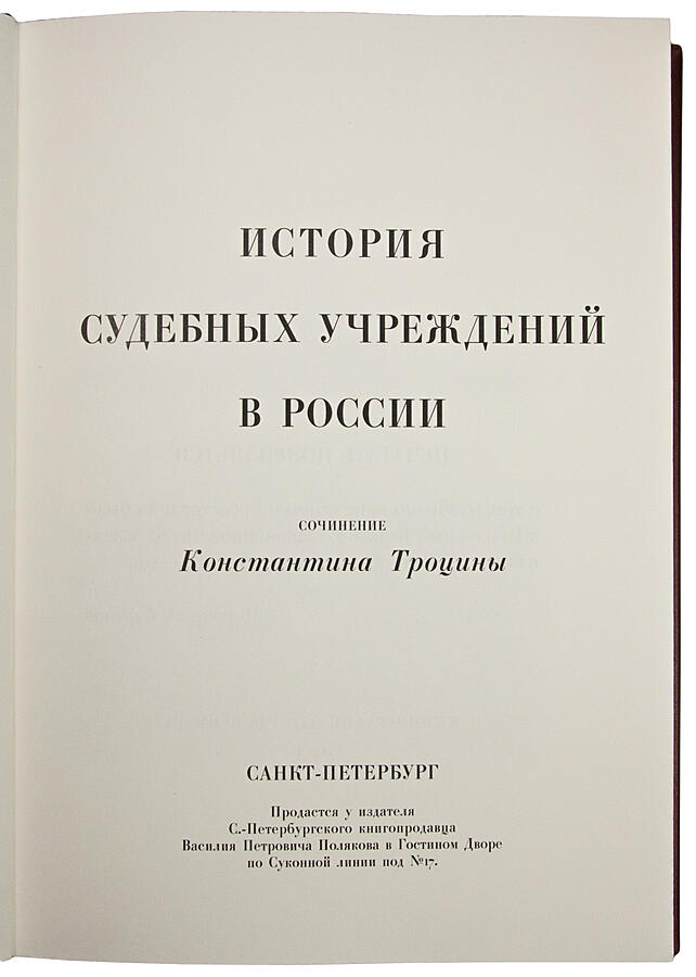 Константин Елисеевич Троцина - общественный деятель, историк, юрист. Его труд представляет собой исчерпывающий обзор судебной власти и судебной деятельности России, начиная с древности и заканчивая серединой XIX века. В первом разделе рассматриваются личные формы судебных учреждений в России, т. е. установление суда на основании Русской Правды, его особенности в таких областях, как Новгород и Псков; судебные учреждения в период перехода от личных к коллегиальным формам показаны во втором разделе: Царская Дума, Расправная Палата и Приказы по подведомственным им областям. Третий раздел охватывает судебные учреждения в формах коллегиальных, появившиеся в результате реформ Петра I.