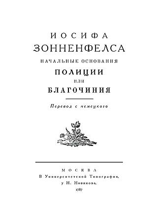 Печатается по изданию: Иосифа Зонненфелса Начальные основания Полиции или Благочиния. - Москва : В Университетской Типографии, у Н. Новикова, 1787.