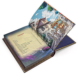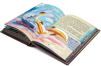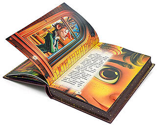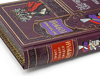 Ручной кожаный перелет, тиснение цветное, блинтовое и рельефное. Книги отпечатаны на дизайнерской бумаге Ozon Ivory, книжные блоки сшиты вручную и отшлифованы. Обрезы книжного блока с трех сторон тонированы и украшены золотым узором, каптал ручного плетения.
