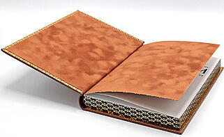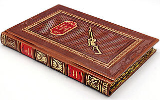 | Описание переплета: | Ручной кожаный переплет, натуральная кожа и золотое тиснение, блок страниц тонирован с нанесением золотого орнамента |