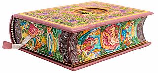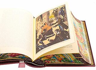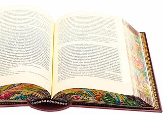 | Описание переплета: | Переплет из французской кожи CHIVRE BRETEUIL. Тиснение на крышке произведено 24 каратным золотом. Блок напечатан на бумаге ACQUERELLO AVORIO. Обложка и обрез книги расписаны вручную |