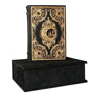 | Исполнение: | Филигрань ручной работы, покрытая серебром, топазы, художественное литье, покрытое серебром. Форзац: шелк муар |