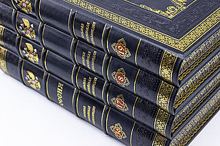 | Описание переплета: | Французский кожаный переплет ручной работы, специально разработанный дизайн тиснения для данного собрания книг |
