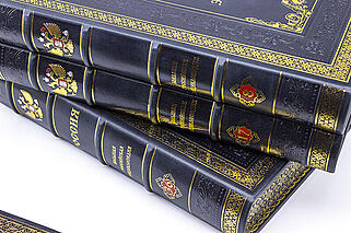 | Исполнение: | Книжные блоки вручную отшлифованы, тонированы с нанесением золотого узора |
